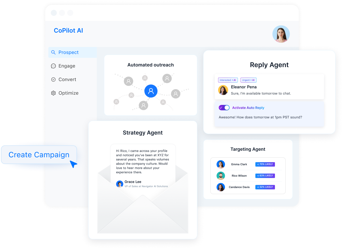 The Reply Agent uses context from the Strategy and Targeting Agents to keep conversations moving towards meetings.